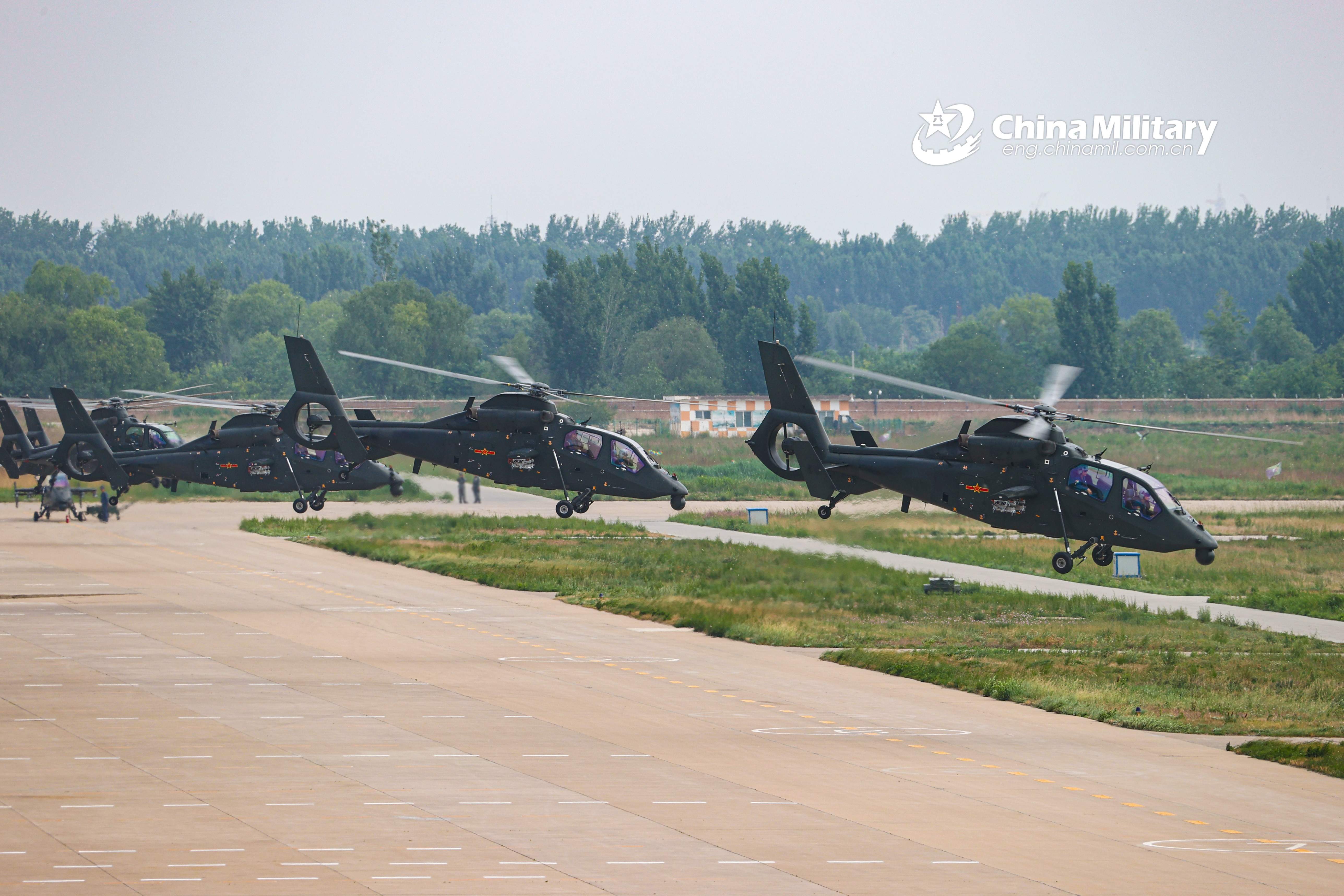 WZ-19 attack helicopters attached to an army aviation brigade under the PLA 81st Group Army execute hover checks before leaving for a flight training task on June 15, 2021. (eng.chinamil.com.cn/Photo by Chen Kai)