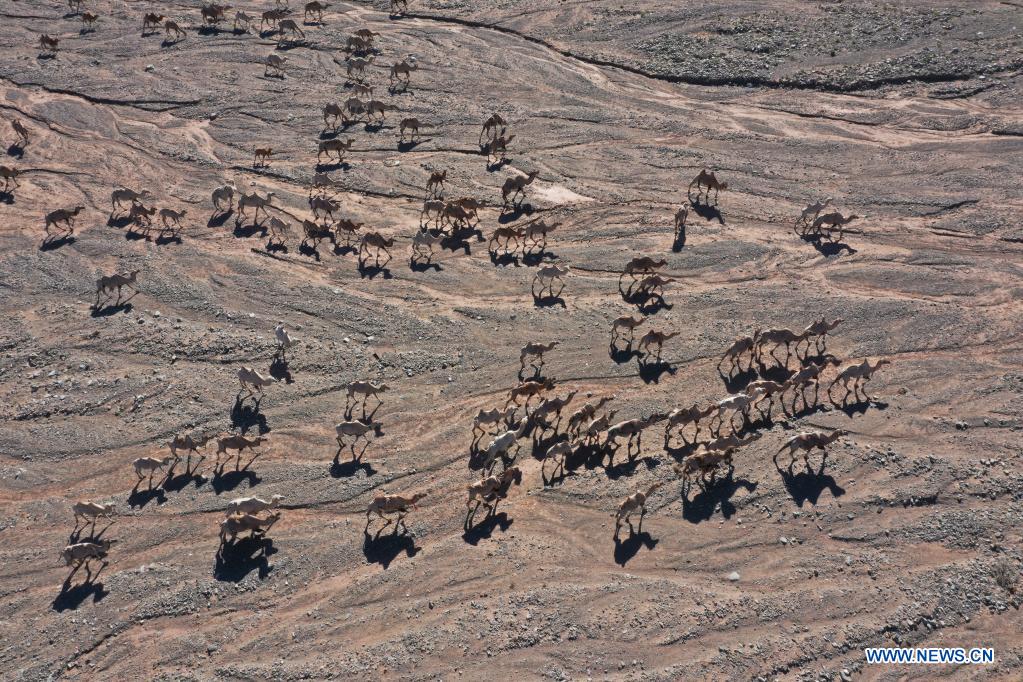 Aerial photo taken on July 7, 2021 shows camels on the way to summer pastures in Aksay Kazakh Autonomous County, Jiuquan, northwest China's Gansu Province. (Photo by Gao Hongshan/Xinhua)