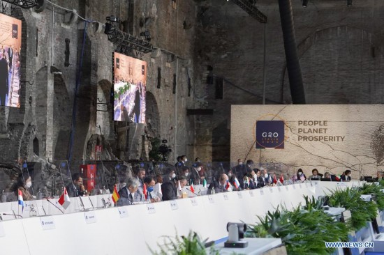 Participants attend the G20 finance ministers and central bank governors meeting in Venice, Italy, on July 9, 2021. Finance ministers of the world's 20 largest economies (G20) on Saturday agreed to go ahead with the plan to design a global tax system that would impose a minimum levy on multinational companies. After a two-day meeting in Venice, the G20 finance ministers and central bank governors reaffirmed the common will to reform the international business tax system. (G20 Italy/Handout via Xinhua)
