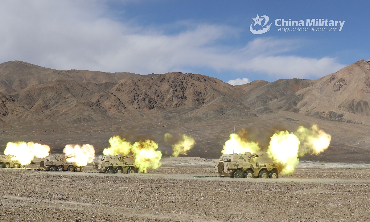 Vehicle-mounted howitzers attached to an artillery detachment with a combined arms regiment under the PLA Army fires high explosive shells at mock remote targets during a live-fire training exercise in depopulated region in mid-June, 2021. The exercise focused on such training items as autonomous surveillance, reduced-crew operation, motorized mobilization. Photo/China Military