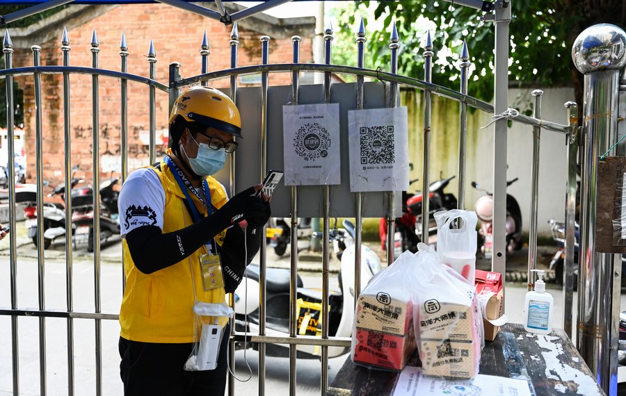 A food courier delivers take-away food to a designated point in Ruili City of southwest China's Yunnan Province, July 8, 2021.(Xinhua/Wang Guansen)
