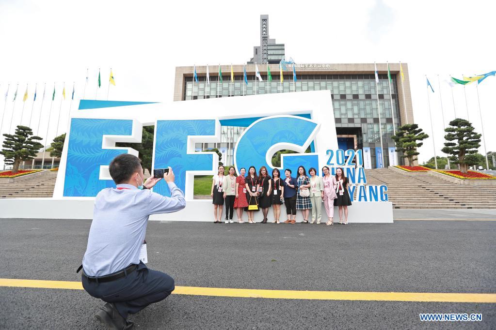 Participants pose for photos at the venue of Eco Forum Global Guiyang 2021 in Guiyang, capital of southwest China's Guizhou Province, on July 12, 2021. China's only national-level global forum themed on ecological civilization, Eco Forum Global Guiyang 2021, opened on Monday in Guiyang. The two-day conference, centering on the country's green and low-carbon transition to build a community of life for humans and nature, will witness a range of online and offline activities. (Xinhua/Liu Xu)