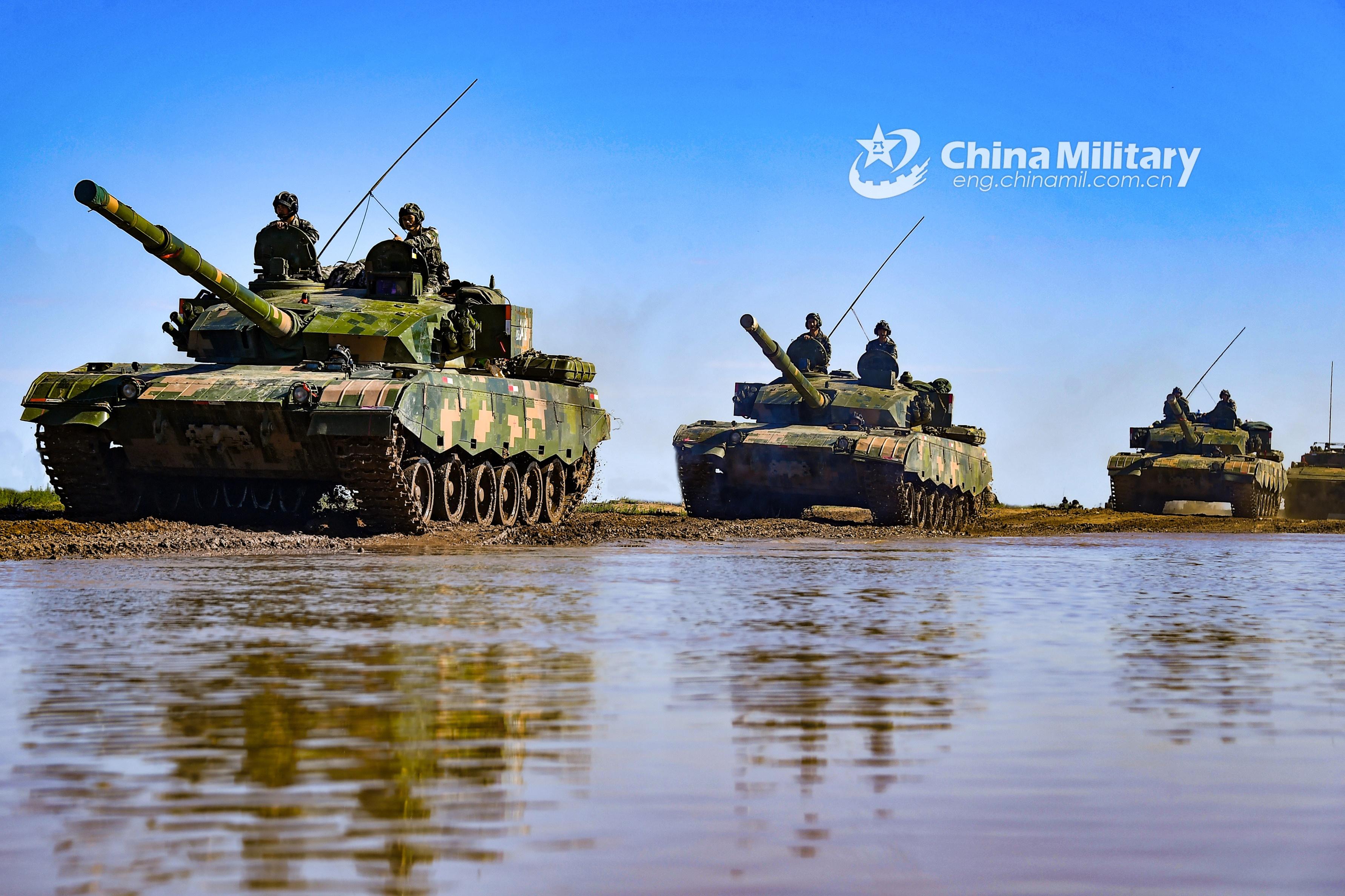 A group of main battle tanks (MBTs) attached to an armored brigade under the PLA 73rd Group Army rumbles through shallow mire during a long-distance maneuver operation on June 26, 2021. (eng.chinamil.com.cn/Photo by Liu Zhiyong)