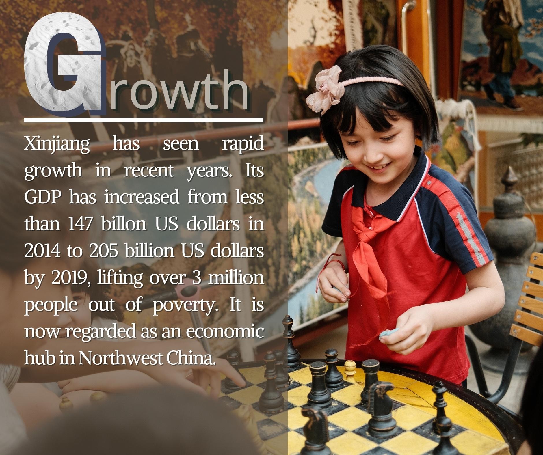 Xinjiang has seen rapid growth in recent years. Its GDP has increased from less than 147 billon US dollars in 2014 to 205 billion US dollars by 2019, lifting over 3 million people out of poverty. It is now regarded as an economic hub in Northwest China.