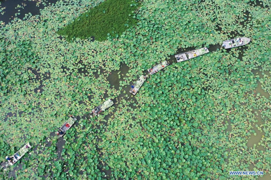 Aerial photo taken on July 14, 2021 shows villagers harvesting lotus leaves on the Hongze Lake in Sihong County, east China's Jiangsu Province. (Photo by Xu Changliang/Xinhua)