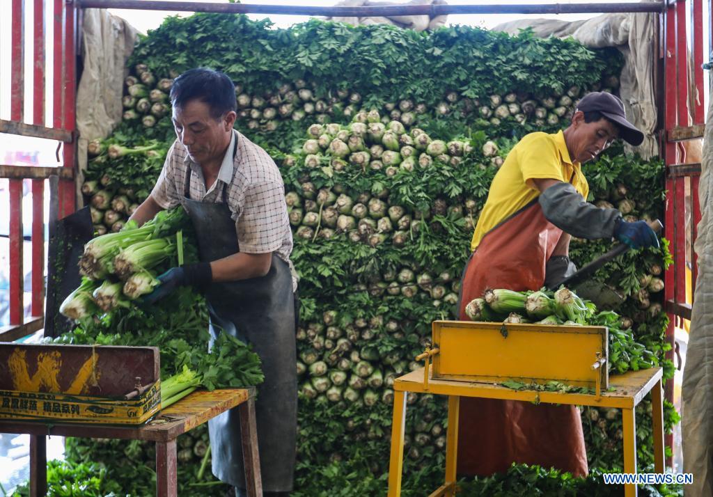 Villagers process highland vegetables at a warehouse in Anding District of Dingxi, northwest China's Gansu Province, July 13, 2021. Taking advantage of the cool summer climate in Dingxi, a plateau city in northwest China, local farmers have been encouraged to plant more than 20 varieties of highland vegetables. By successfully selling these vegetables to the country's coastal provinces, the local highland vegetable businesses have proven a key industry that boosts rural income growth. (Xinhua/Ma Xiping)