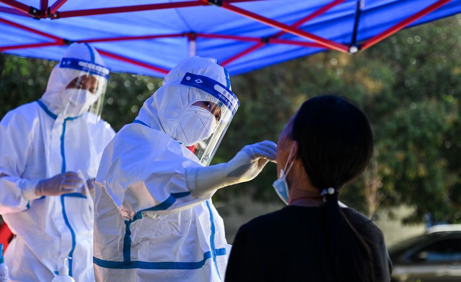 A medical worker collects a swab sample for nucleic acid test in Ruili City of southwest China's Yunnan Province, July 8, 2021. (Xinhua/Wang Guansen)