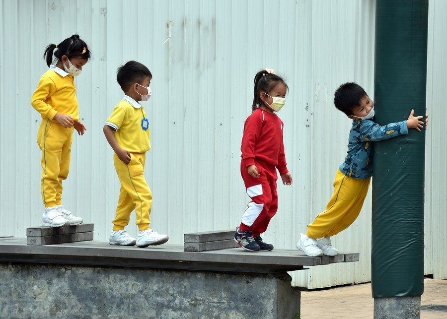 Children wearing face masks play outside in Hong Kong, south China, March 26, 2021. (Xinhua/Lo Ping Fai)