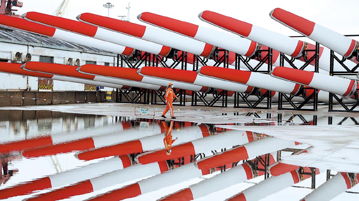 Wind turbine components are ready to be shipped from a dock in Lianyungang, Jiangsu province, on Thursday. [Photo by Wang Chun/For China Dailly]