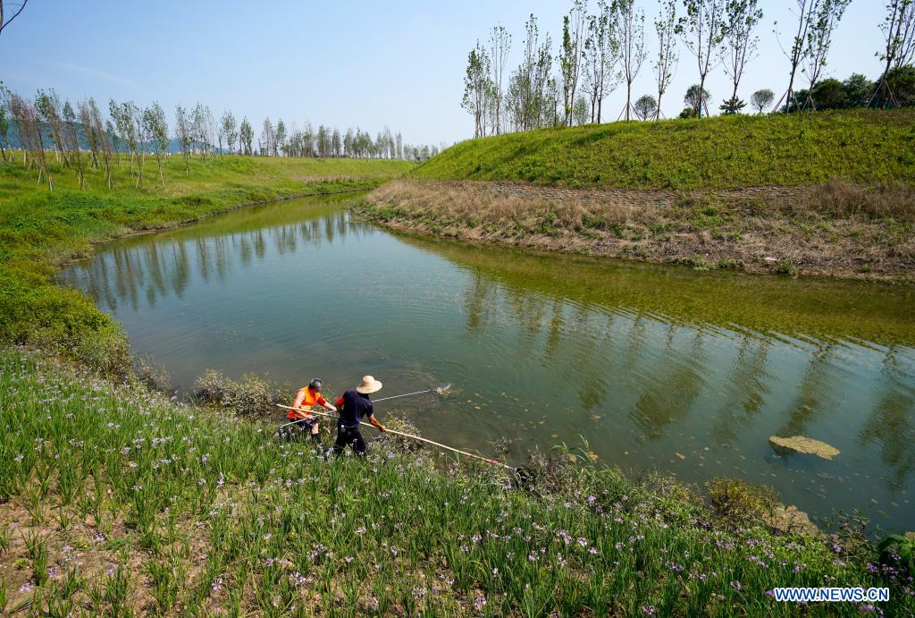 Members of a watercourse patrol team clean the Hangu section of Liangtan River in southwest China's Chongqing, July 14, 2021. The water quality and ecosystem of Liangtan River in Chongqing has been improved in recent years thanks to the city's ecological restoration efforts. (Xinhua/Liu Chan)