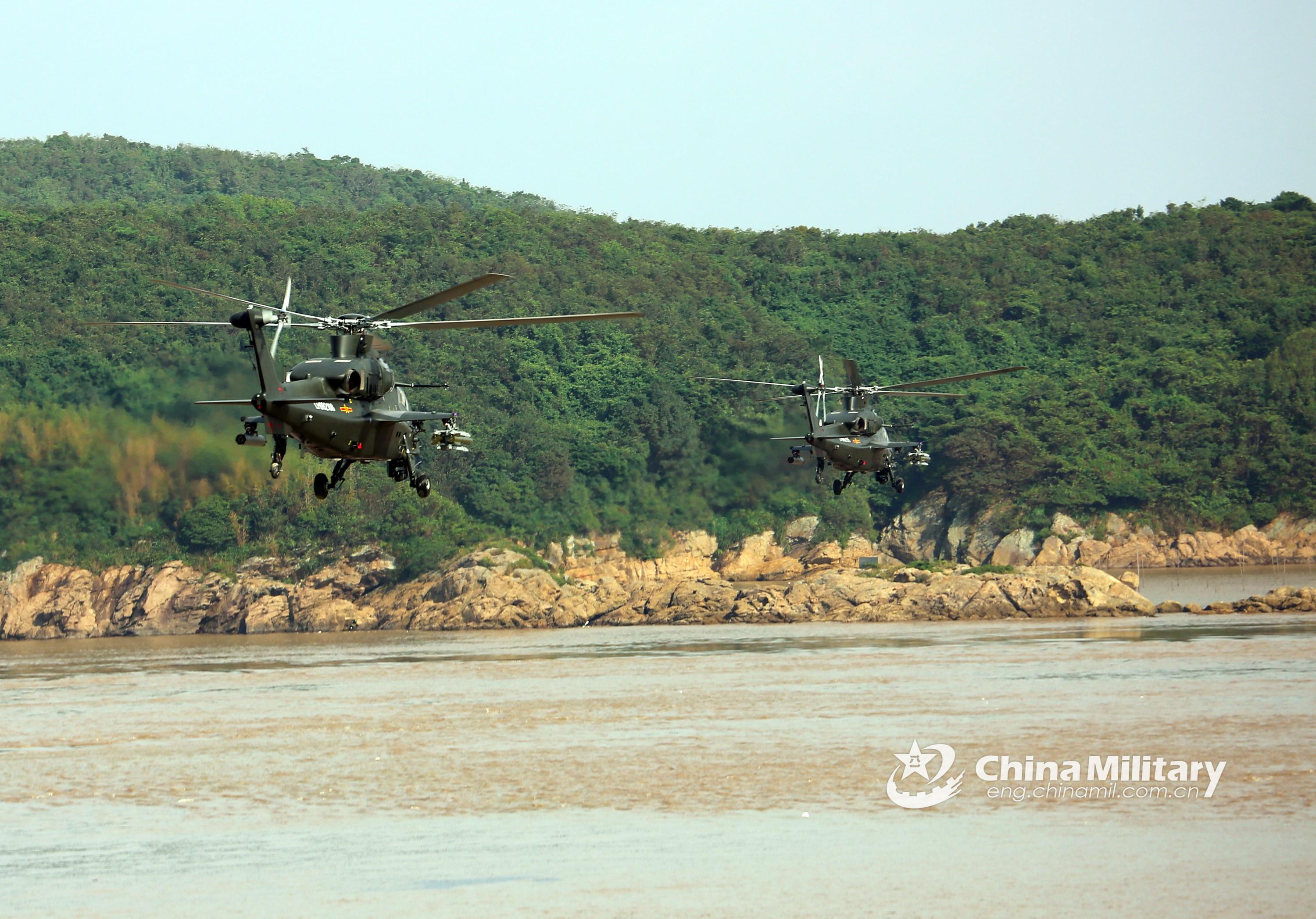 Two attack helicopters attached to an army aviation brigade under the PLA Eastern Theater Command hover at an ultra-low altitude when approaching a target region during a flight training exercise on June 9, 2021. The flight training covered the subjects of two-plane formation flight, island defense penetration at low-altitude, maritime assault, etc. (eng.chinamil.com.cn/Photo by Zhang Huanpeng)