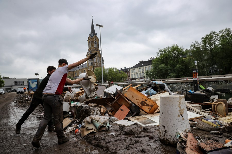 People throw away broken furnitures after floods in Verviers, Belgium, July 16, 2021. (Xinhua/Zhang Cheng)