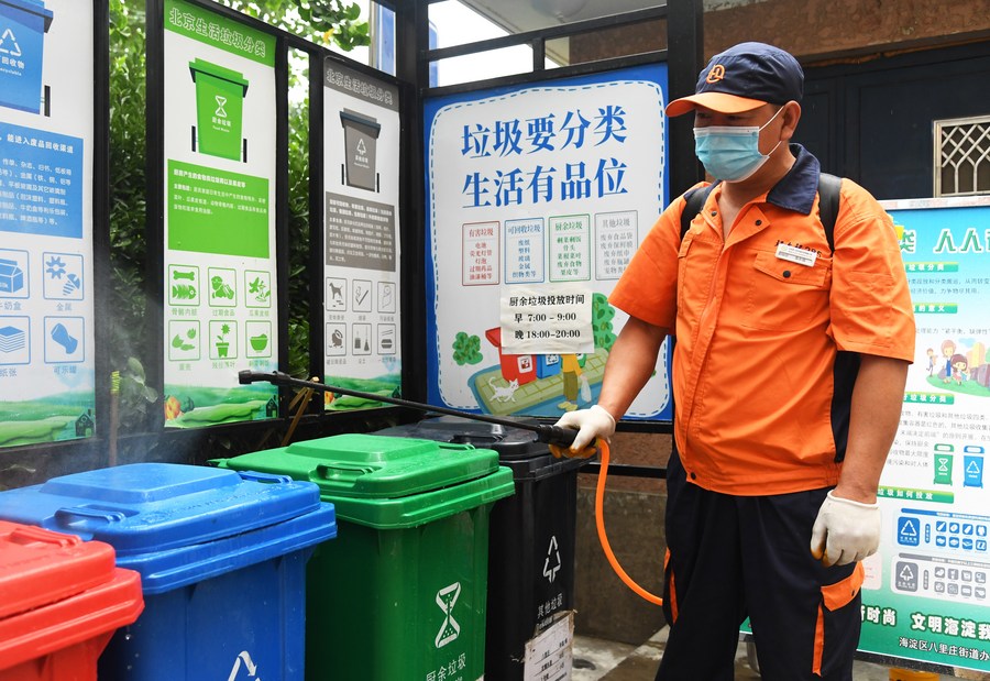 A worker disinfects garbage cans at a community in Balizhuang Street of Haidian District, Beijing, capital of China, June 23, 2020. (Xinhua/Ren Chao)