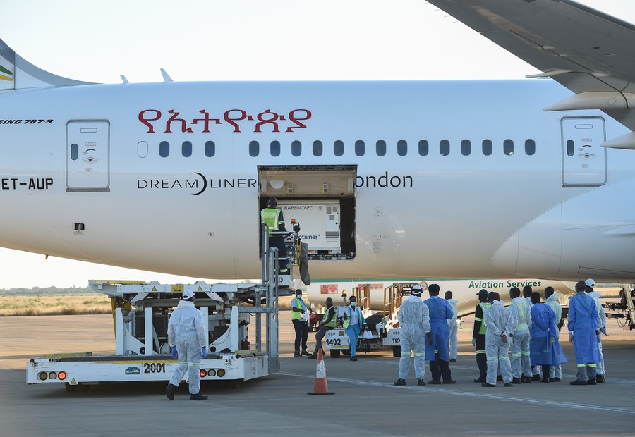 Staff members unload China-donated Sinovac COVID-19 vaccines at Sir Seretse Khama International Airport in Gaborone, Botswana, April 25, 2021. (Photo by Tshekiso Tebalo/Xinhua)