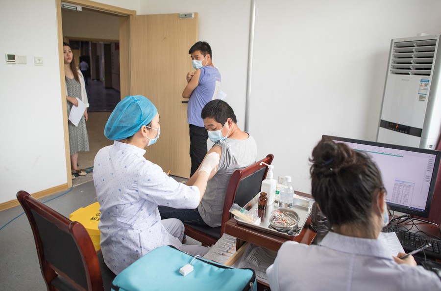 A man receives a dose of COVID-19 vaccine at a vaccination site in Jiangxia District in Wuhan, central China's Hubei Province, June 9, 2021. (Xinhua/Xiao Yijiu)