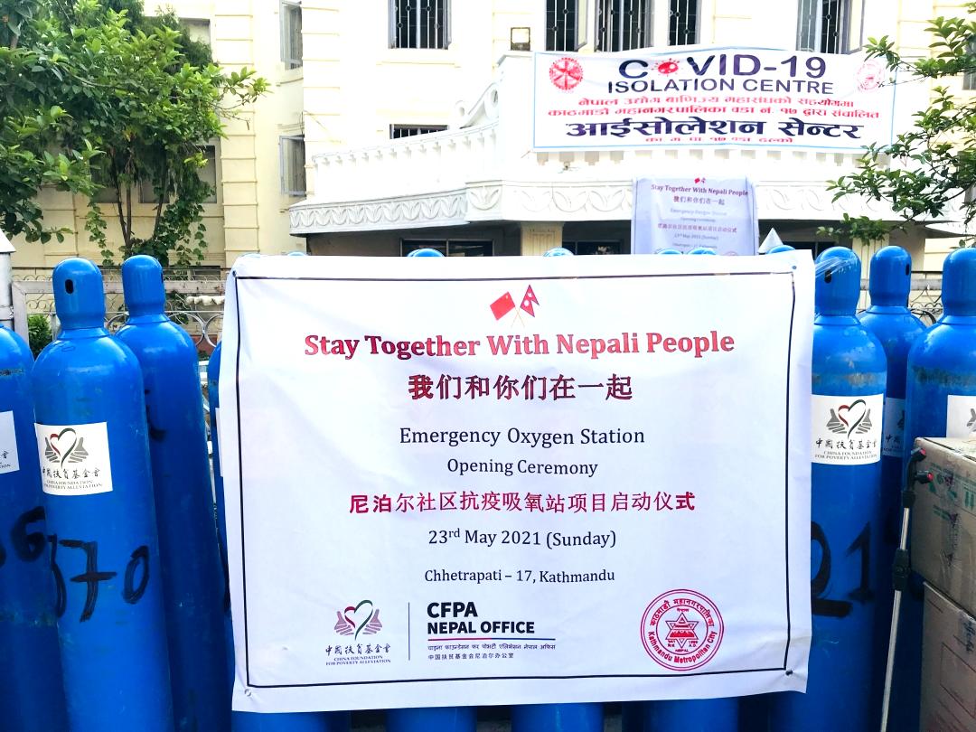 China Foundation for Poverty Alleviation holds an opening ceremony for an emergency oxygen station project in Katmandu, Nepal, May 23, 2021. The foundation has donated three oxygen stations to the country, including 50 oxygen cylinders, 200 sets of personal protective kits, and two sterilizers, to help Nepal fight against COVID-19. (Photo by China Foundation for Poverty Alleviation)