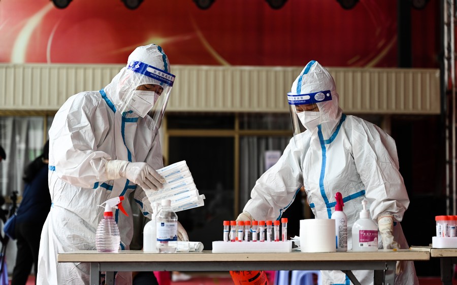 Medical workers sort out swab samples for nucleic acid test in Ruili City of southwest China's Yunnan Province, on July 5, 2021. (Xinhua/Wang Guansen)