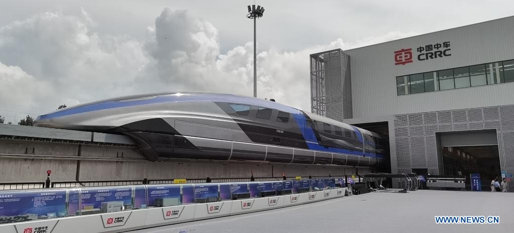 Photo taken with a mobile phone on July 20, 2021 shows China's new maglev transportation system in Qingdao, east China's Shandong Province. China's new high-speed maglev train rolled off the production line on Tuesday. It has a designed top speed of 600 km per hour -- currently the fastest ground vehicle available globally. The new maglev transportation system made its public debut in the coastal city of Qingdao, east China's Shandong Province. It has been self-developed by China, marking the country's latest scientific and technological achievement in the field of rail transit, according to the China Railway Rolling Stock Corporation. (Xinhua/Wang Kai)