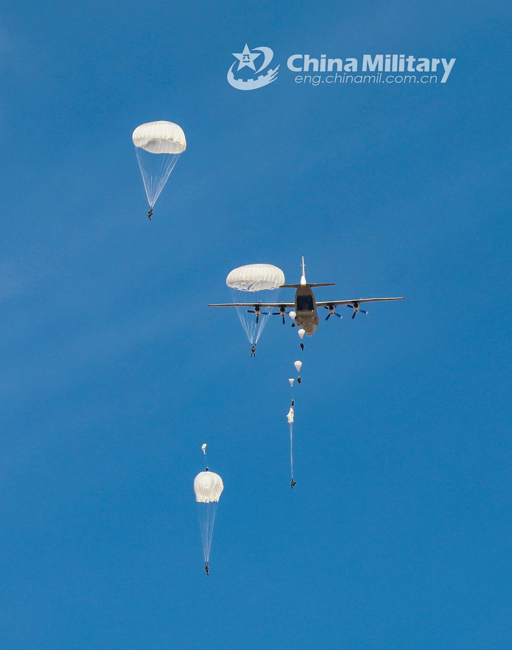 Paratroopers assigned to a brigade of the PLA Air Force’s airborne troops descend to the ground after jumping out of a transport aircraft during a recent massive airborne assault training operation on July 3, 2021. (eng.chinamil.com.cn/Photo by Yang Jielin)