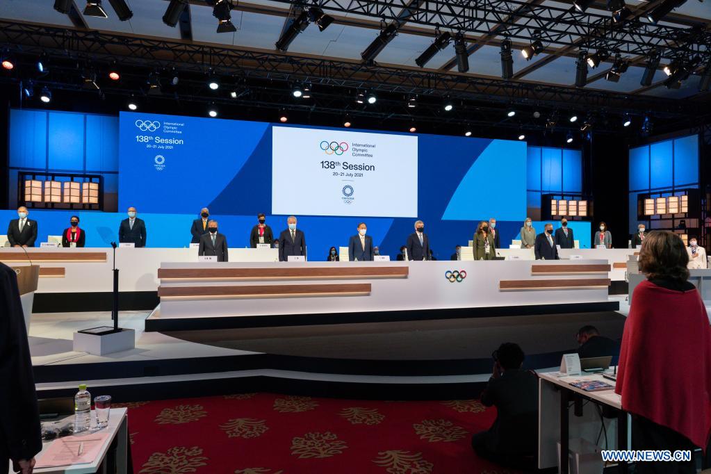 Members of the International Olympic Committee (IOC) attend the 138th IOC Session in Tokyo, Japan, on July 20, 2021. The move of adding "together" into the Olympic motto of "faster, higher, stronger" was unanimously approved at the 138th IOC session here on Tuesday. (IOC/Handout via Xinhua)
