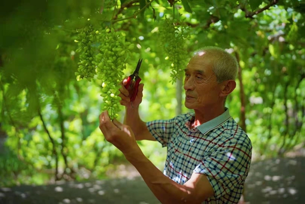 A local farmer in Turpan inspecting his grapes, which will soon be dried and processed into raisins. (People’s Daily Online/Zhang Ruohan)