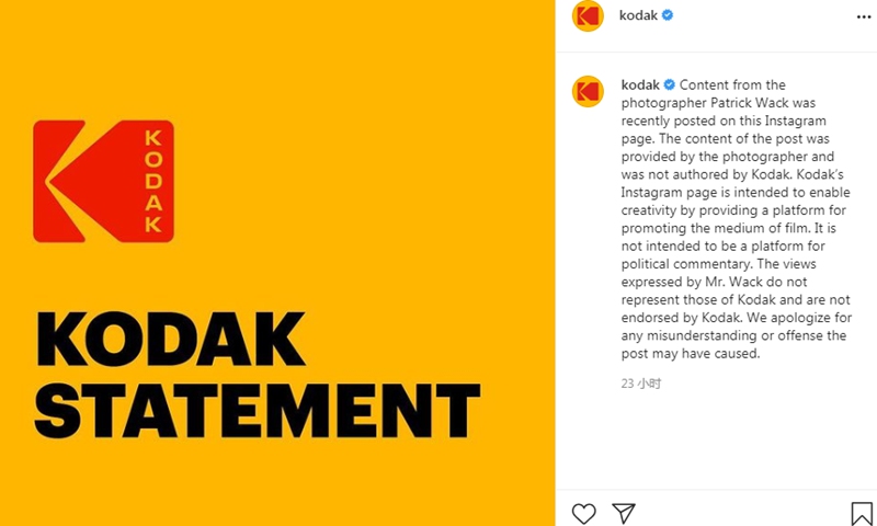 Kodak apologized on Tuesday for posting photos of Northwest China's Xinjiang Uygur Autonomous Region on Instagram with description that says Xinjiang is under "acute repression."