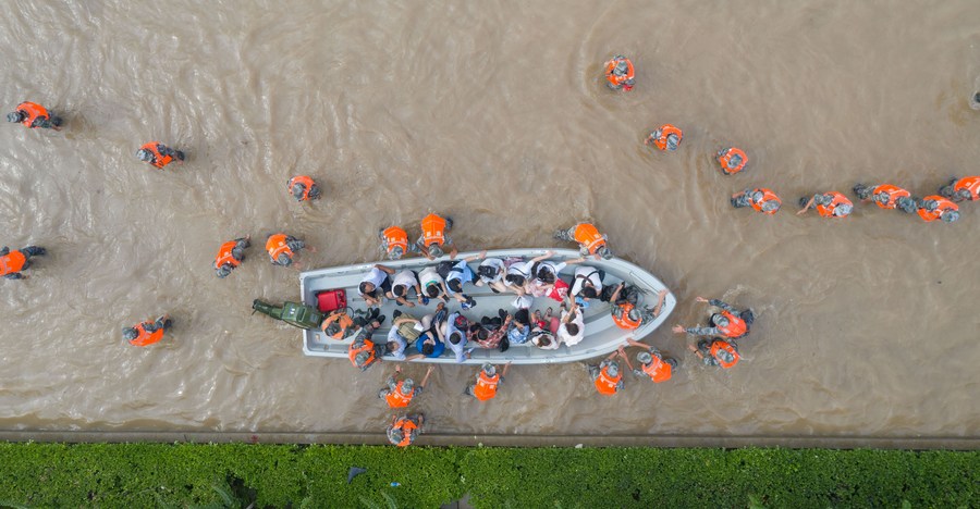 Aerial photo taken on July 22, 2021 shows rescuers evacuating stranded people outside the Fuwai Central China Cardiovascular Hospital in flood-hit Zhongmu County of Zhengzhou, central China's Henan Province. (Xinhua/Cai Yang)