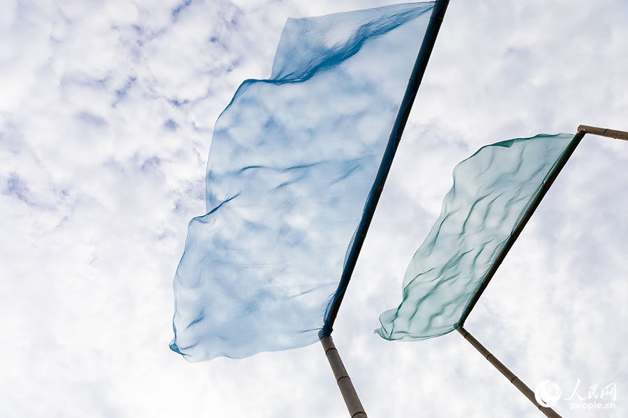 | Photo shows fabrics colored with plant-based dyes dancing in the wind. (People’s Daily Online/Jiao Yan) |
