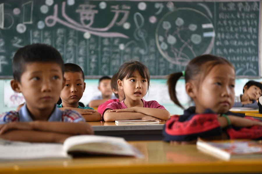 Pupils have a class at Yuanlong Primary School in Yuanlong Village, Minning Town of Yinchuan, northwest China's Ningxia Hui Autonomous Region, Sept. 3, 2019. (Xinhua/Wang Peng)