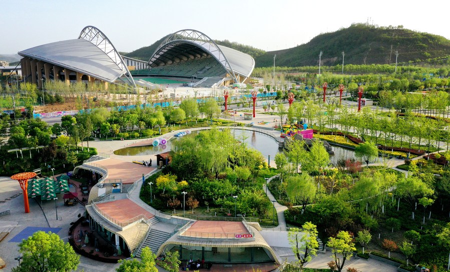 Aerial photo taken on May 8, 2021 shows a cultural park in Yan'an New District in Yan'an City, northwest China's Shaanxi Province. (Xinhua/Liu Xiao)