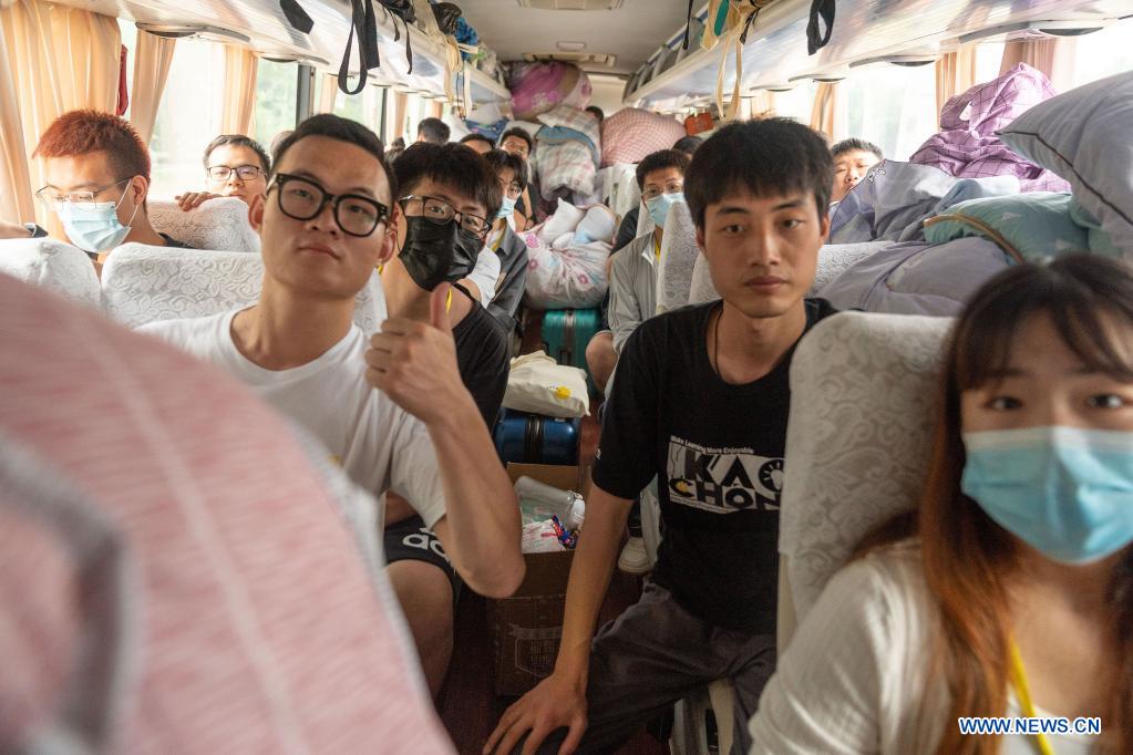 Stranded students are evacuated at the entrance of Zhongyuan Institute of Science and Technology in flood-hit Zhengzhou, central China's Henan Province, July 23, 2021. (Xinhua/Cai Yang)