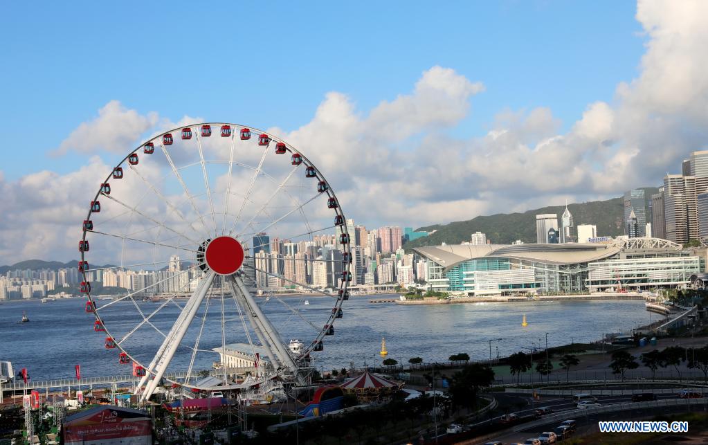Photo taken on July 8, 2021 shows a view of a ferris wheel and Hong Kong Convention and Exhibition Center in Hong Kong, south China. (Xinhua/Wu Xiaochu)