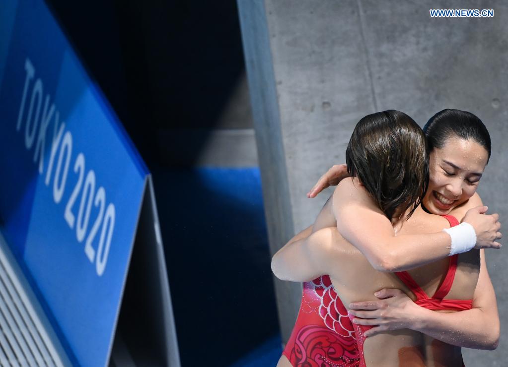 Shi Tingmao (front) and Wang Han of China hug each other during the women's synchronised 3m springboard final of diving at Tokyo 2020 Olympic Games in Tokyo, Japan, July 25, 2021. (Xinhua/Wang Jingqiang)