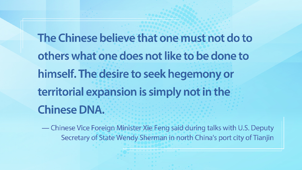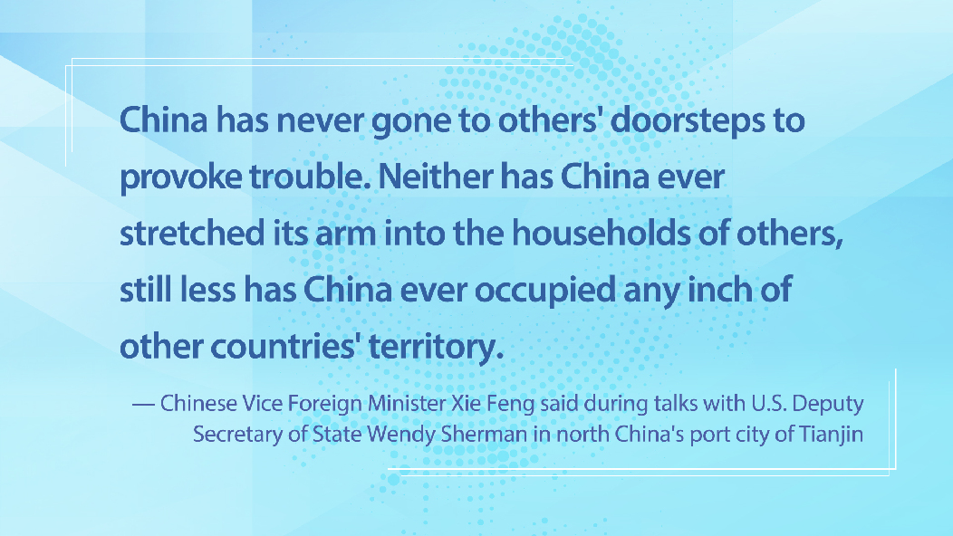 Xie made the remarks on Monday during talks with U.S. Deputy Secretary of State Wendy Sherman, who is on a visit to north China's port city of Tianjin from July 25 to 26.