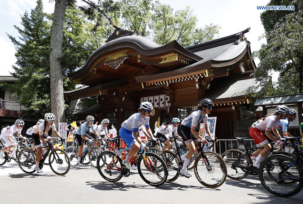 Riders pass the Okunitama Shrine during the women's cycling road race at the Tokyo 2020 Olympic Games in Tokyo, Japan, July 25, 2021. (Xinhua/Wang Lili)