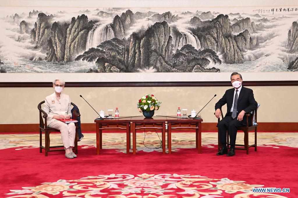 Chinese State Councilor and Foreign Minister Wang Yi (R) meets with U.S. Deputy Secretary of State Wendy Sherman in north China's Tianjin on July 26, 2021. (Xinhua/Li Ran)