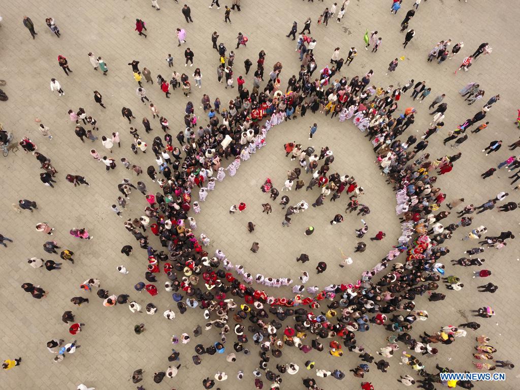 Aerial photo taken on Feb. 19, 2021 shows tourists and villagers dancing on a square at Huawu Village in Xinren Miao Township, Qianxi City, southwest China's Guizhou Province. Huawu Village, although boasting unique ethnic Miao culture and splendid mountain views with vast water bodies, once had a poverty headcount ratio as high as 63.6 percent. Taking advantage of the rich cultural and natural heritage, the local government initiated a scenic area project as a targeted measure to shake off poverty to boost tourism by constructing a "miles-long gallery" . The village that once had no roads, tap water and electricity supply and was isolated from the outside world is now bustling with tourists. (Xinhua/Yang Wenbin)