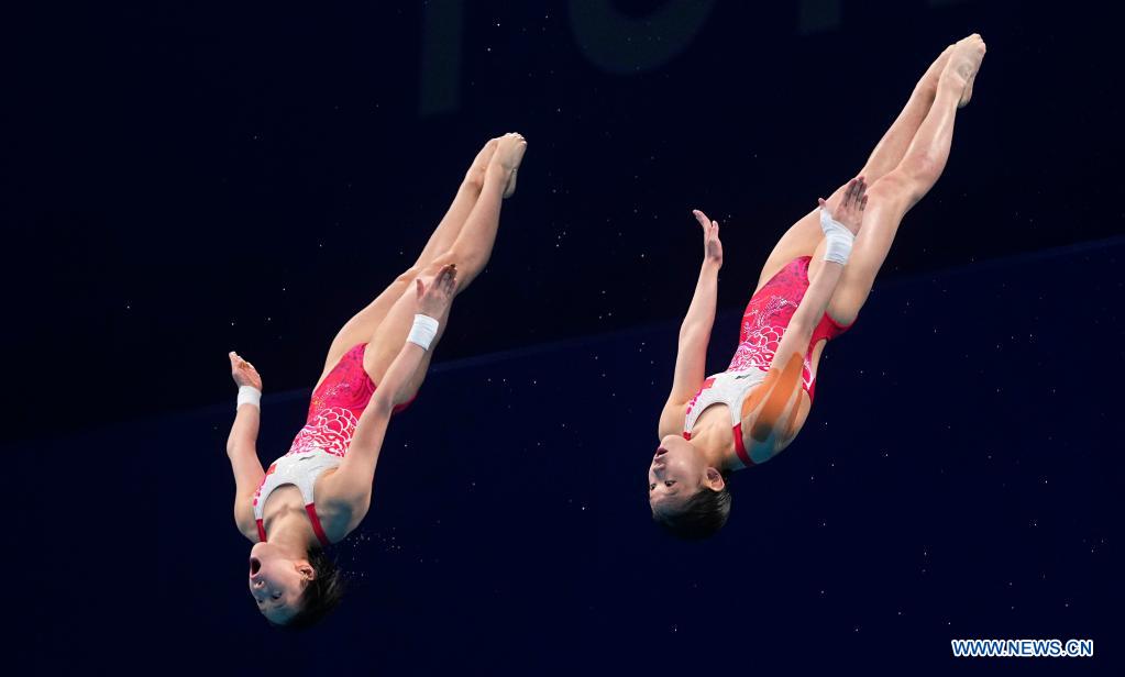 Chen Yuxi and Zhang Jiaqi of China compete during the women's synchronised 10m platform final of diving at Tokyo 2020 Olympic Games in Tokyo, Japan, July 27, 2021. (Xinhua/Xu Chang)