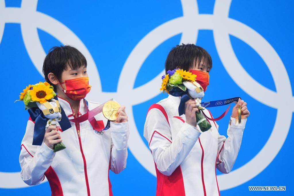 Chen Yuxi (R) and Zhang Jiaqi of China celebrate on the awarding ceremony of women's synchronised 10m platform of diving at Tokyo 2020 Olympic Games in Tokyo, Japan, July 27, 2021. (Xinhua/Xu Chang)