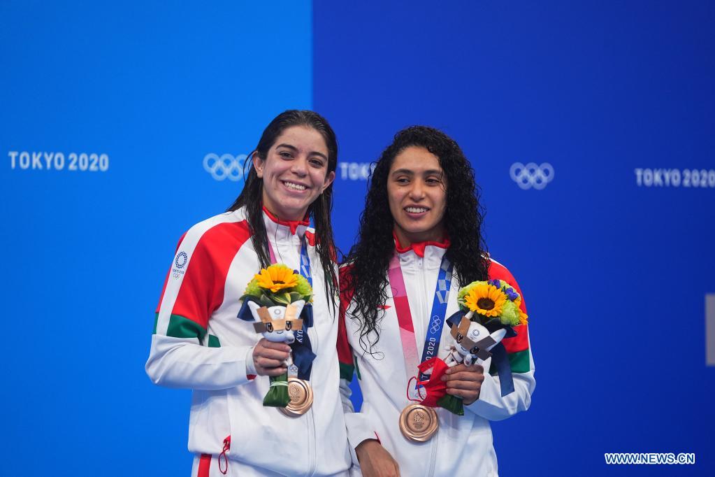 Bronze medalists Gabriela Agundez Garcia and Alejandra Orozco Loza of Mexico pose for a photo on the awarding ceremony of women's synchronised 10m platform of diving at Tokyo 2020 Olympic Games in Tokyo, Japan, July 27, 2021. (Xinhua/Xu Chang)