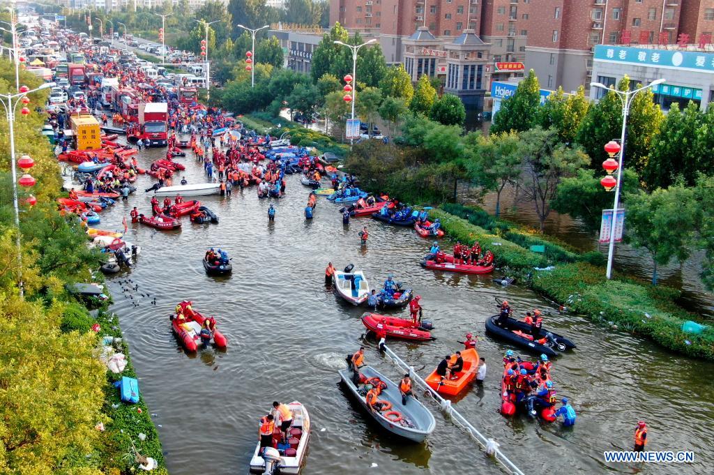 Aerial photo taken on July 26, 2021 shows the rescue scene outside the First Affiliated Hospital of Xinxiang Medical University in Weihui, Xinxiang City of central China's Henan Province. Weihui is suffering from serious flooding caused by heavy downpours in the past few days. Rescuers and volunteers gather at the power-disrupted First Affiliated Hospital of Xinxiang Medical University to transfer patients to safe areas. (Xinhua/Hao Yuan)