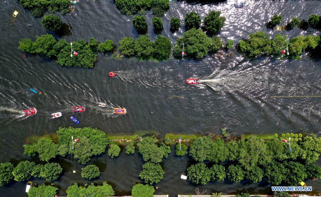 Aerial photo taken on July 27, 2021 shows rescue boats in the waterlogged urban area of Weihui City in Xinxiang, central China's Henan Province. Weihui City suffered from severe urban waterlogging due to the extremely heavy rainfall. (Xinhua/Li An)