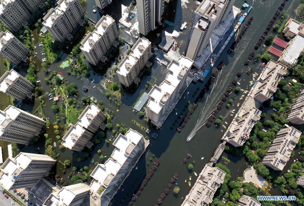Aerial photo taken on July 27, 2021 shows a rescue boat in the waterlogged urban area of Weihui City in Xinxiang, central China's Henan Province. Weihui City suffered from severe urban waterlogging due to the extremely heavy rainfall. (Xinhua/Li An)
