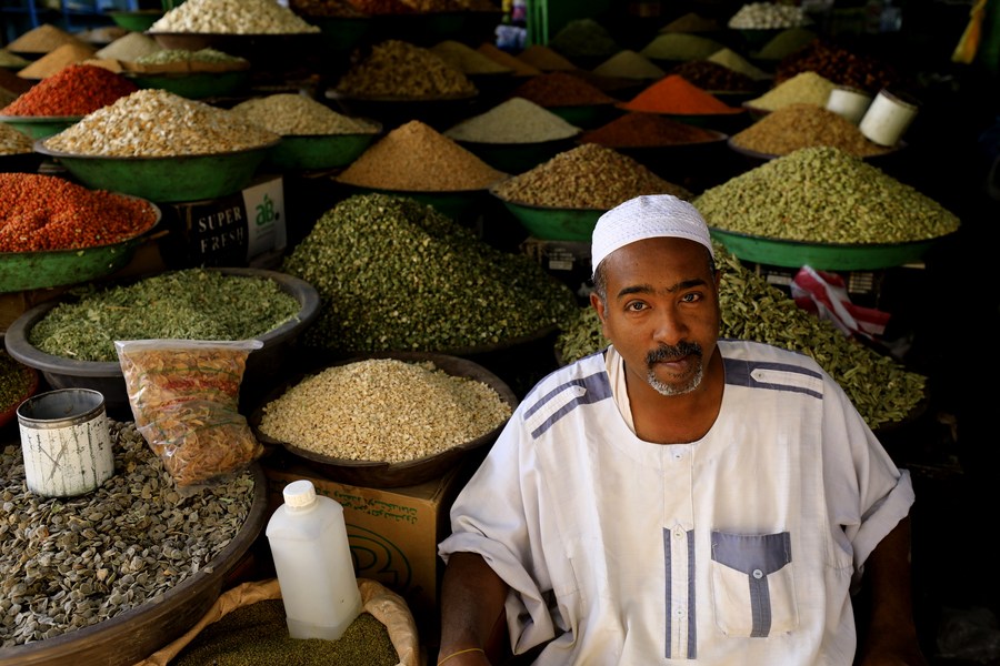 A vendor sells products at a local market in Khartoum, Sudan, March 16, 2021. (Photo by Mohamed Khidir/Xinhua)