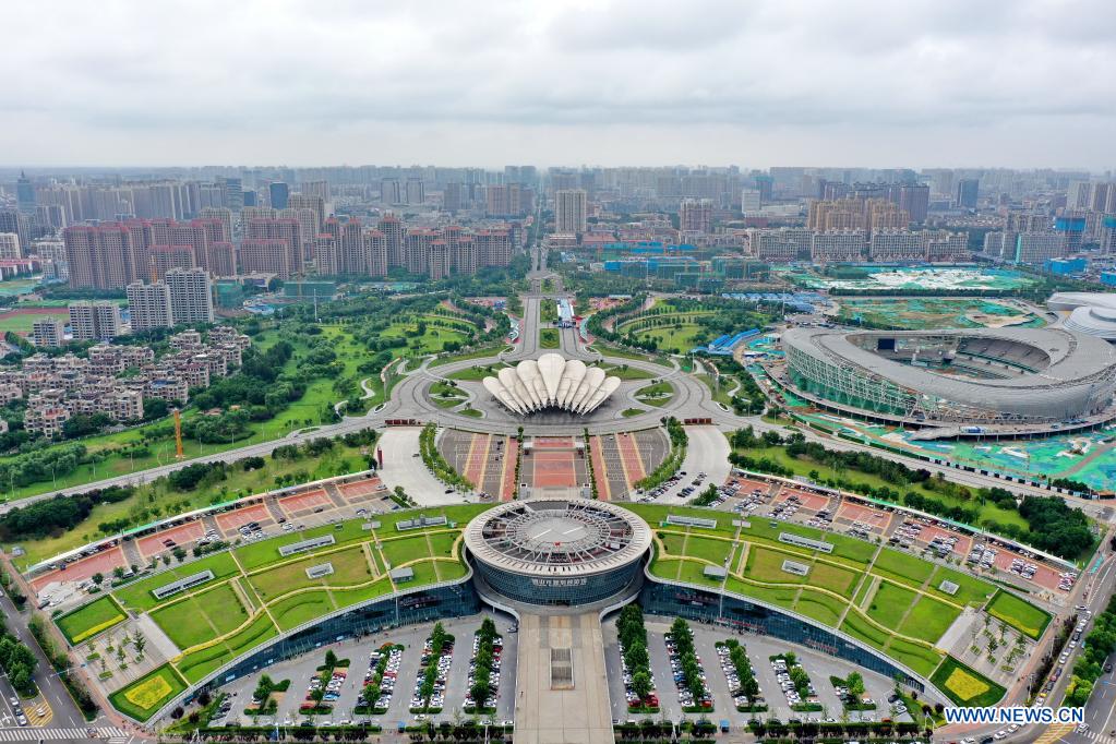 Aerial photo taken on July 27, 2021 shows an urban view of Tangshan City, north China's Hebei Province. Tangshan City in north China's Hebei Province, leaning against the Yanshan Mountains, facing the Bohai Sea, and abutting Beijing and Tianjin, has worked hard to rebuild itself since that tragic earthquake in 1976. In the early hours of July 28, 1976, one of the deadliest earthquakes of the 20th century razed the city to the ground, killing more than 240,000 people and injuring another 160,000. (Xinhua/Mu Yu)
