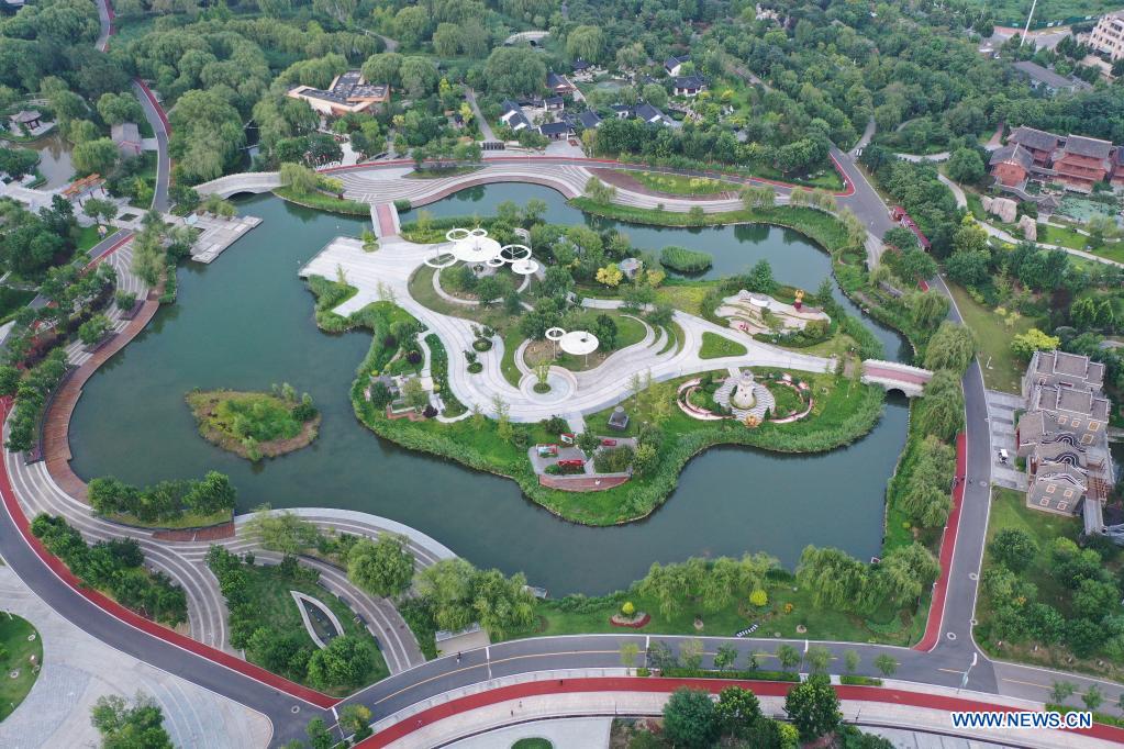 Aerial photo taken on July 26, 2021 shows the Nanhu lake park in Tangshan City, north China's Hebei Province. Tangshan City in north China's Hebei Province, leaning against the Yanshan Mountains, facing the Bohai Sea, and abutting Beijing and Tianjin, has worked hard to rebuild itself since that tragic earthquake in 1976. In the early hours of July 28, 1976, one of the deadliest earthquakes of the 20th century razed the city to the ground, killing more than 240,000 people and injuring another 160,000. (Xinhua/Jin Haoyuan)