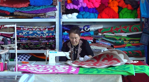 As one Kazak proverb goes. "Songs and horses are two wings of the Kazak people, and embroidery is a dream that is always alive in our hearts". Bikmali, an ingenious Kazak woman, learned how to embroider at a young age and has always been engaged in embroidery. Before buying a machine in 2010, she did all her work by hand. Whenever the machine broke, her husband would fix it. As for her two adorable and considerate daughters, she hopes they can live happy lives.
