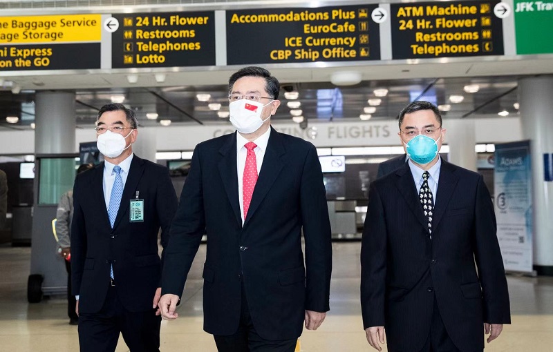 Upon arrival, Qin was greeted by Deputy Chief of Mission of the Chinese Embassy Li Kexin, Consul General in New York Huang Ping and other Chinese diplomats in the United States, according to the official website of the Chinese embassy.
