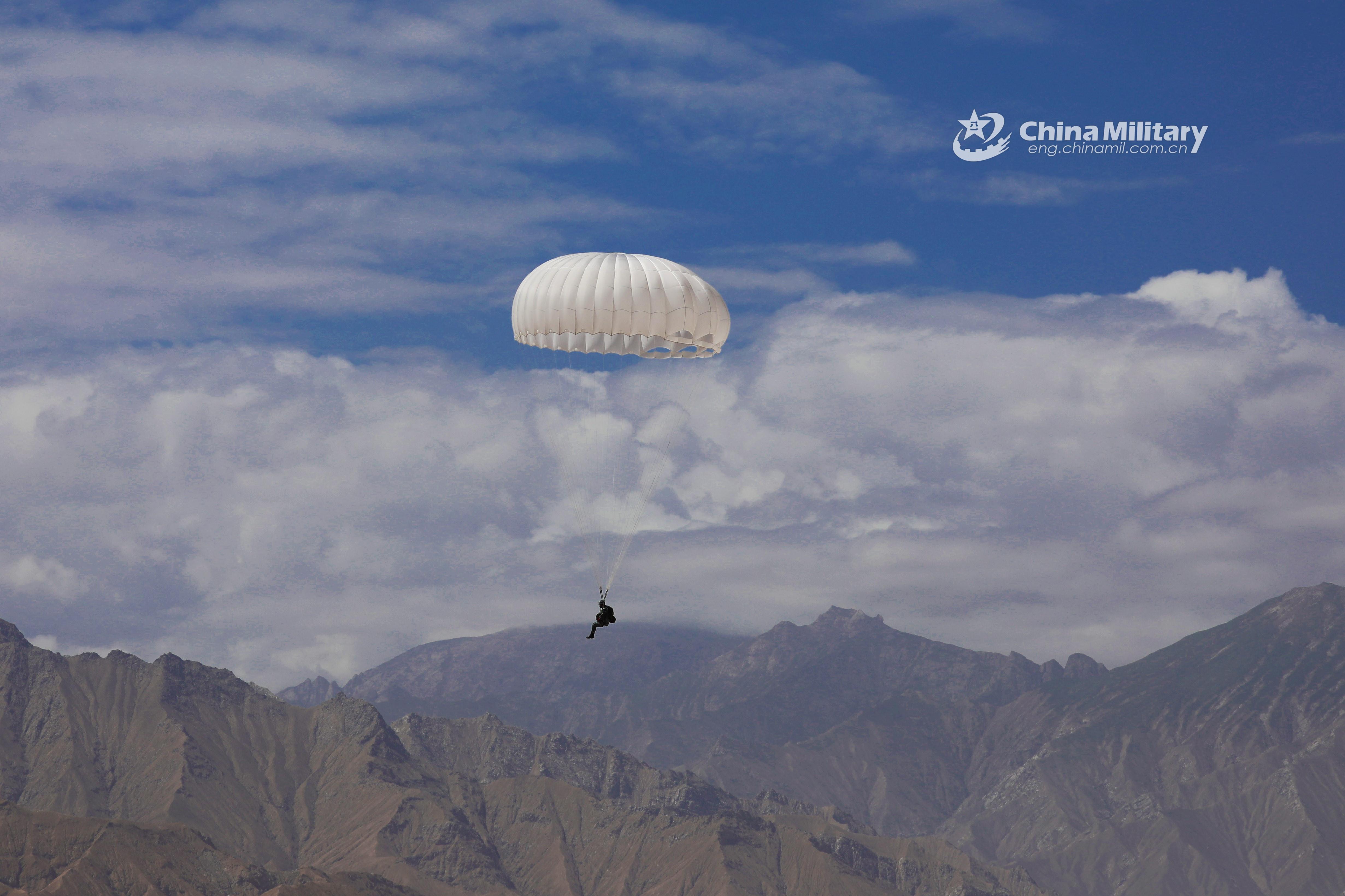 A paratrooper assigned to a brigade of the PLA Air Force’s airborne troops descends with his parachute during a parachuting exercise on July 15, 2021. The exercise aimed to train the troops’ rapid mobility, long-range penetration and other realist combat skills in high altitude areas. (eng.chinamil.com.cn/Photo by Ma Zian)