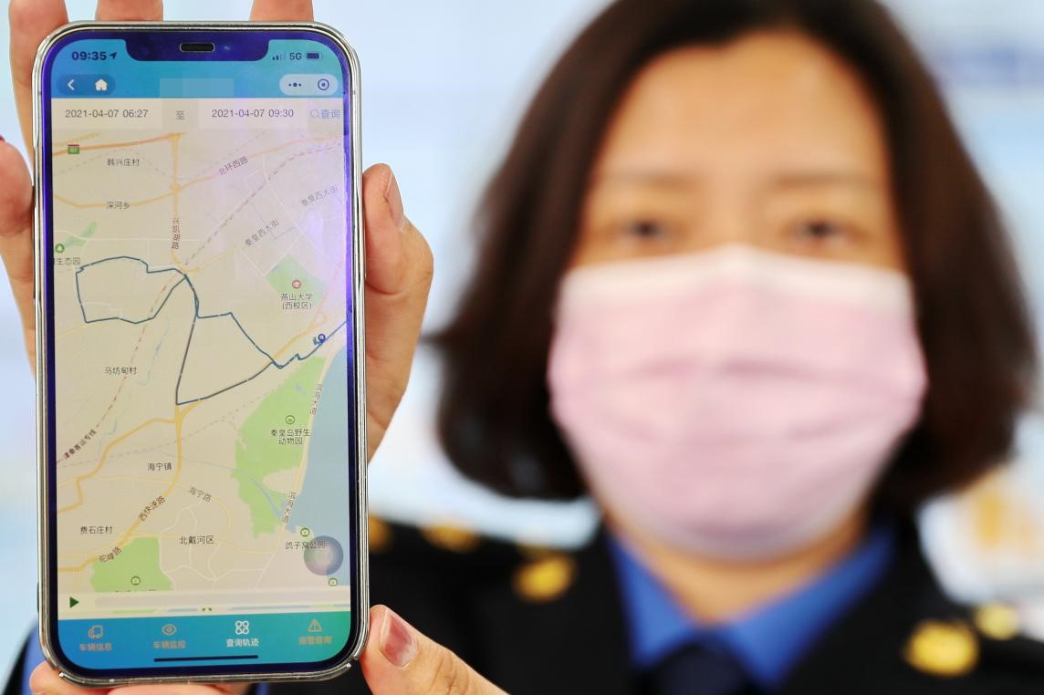 An officer of the urban management and law enforcement bureau in Haigang district, Qinhuangdao city, north China’s Hebei province, demonstrates how a smart platform records the route of a muck truck, April 8, 2021. (Photo by Cao Jianxiong/People’s Daily Online)